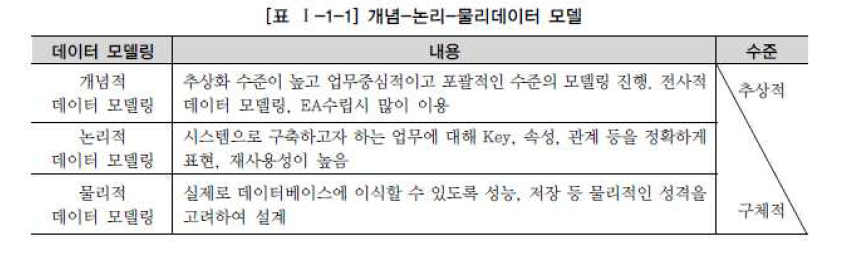 - 데이터 모델은 건축물로 표현시 설계도면에 해당.