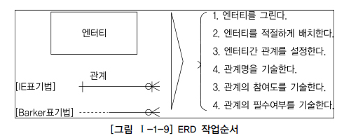 2. 일반적으로 ERD를 작성하는 방법은 엔터티 도출 -> 엔터티 배치 -> 관계 설정 -> 관계명 기술의 흐름으로 작업을 진행한다.