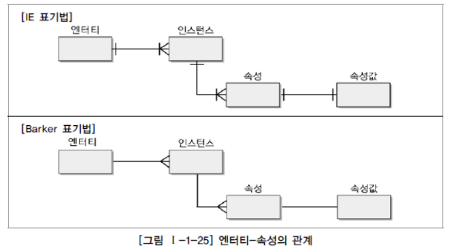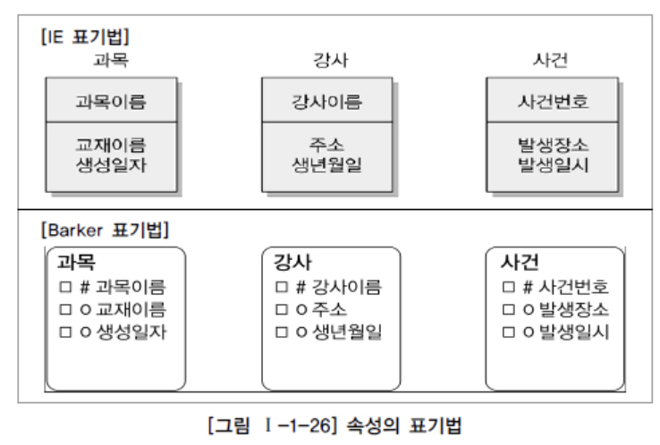 - 속성 : 각각의 엔터티는 고유의 성격을 표현하는 속성 정보를 두 개 이상 갖음