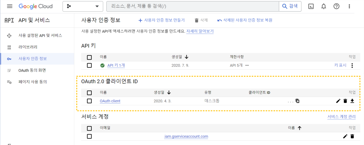 먼저 google cloud platform에서 api 관련 정보를 가져온다. 구글 클라우드 플랫폼에서 [자신의 프로젝트] -> [API 및 서비스] -> [사용자 인증 정보]를 누르면 생성했던 OAuth 2.0 클라이언트 id가 있다. 가장