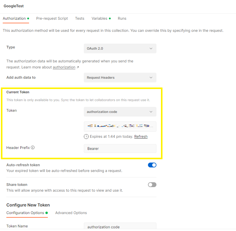 4. Postman의 Authorization 에 Configure을 작성한다. (내 경우 Cllection에 셋팅하였다)