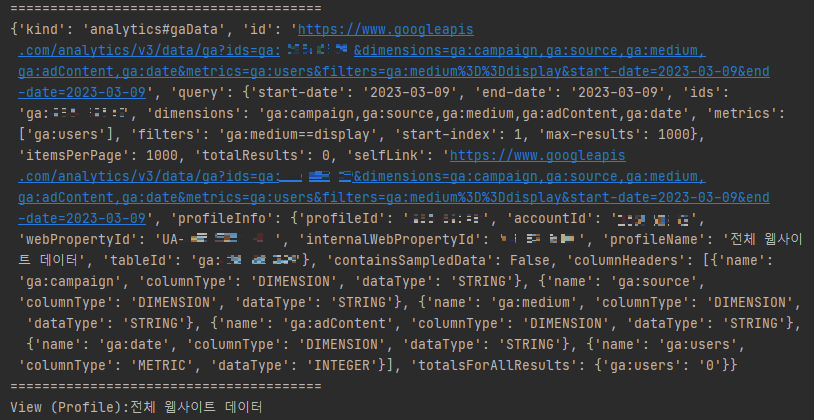 #기존 쿼리 컨버팅. 보고자 하는 dimension, metrics, filter 를 수정하여 확인