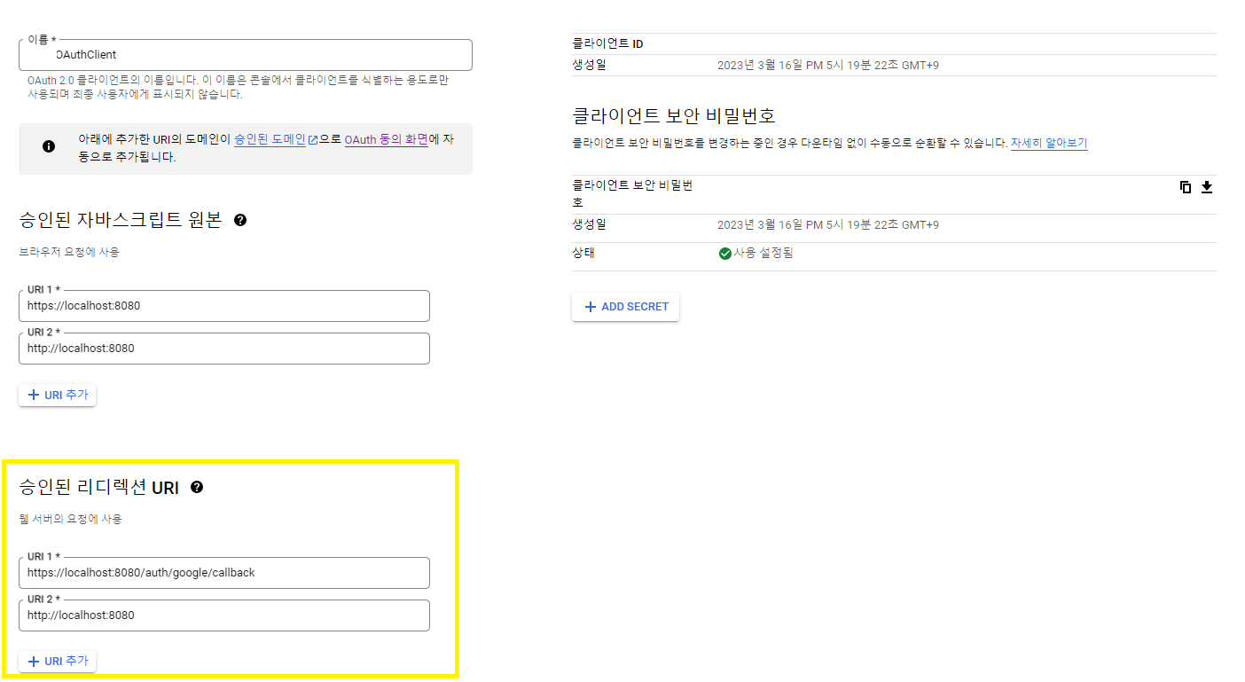 이전 포스팅에서 말했다 싶이 redirect_url 은 API ConsoleCredentials page 에서 셋팅한 리디렉션 URL 중 하나와 일치해야 하기에 서비스어카운트의 리다이렉트 url을 맞춰 줘야 한다.