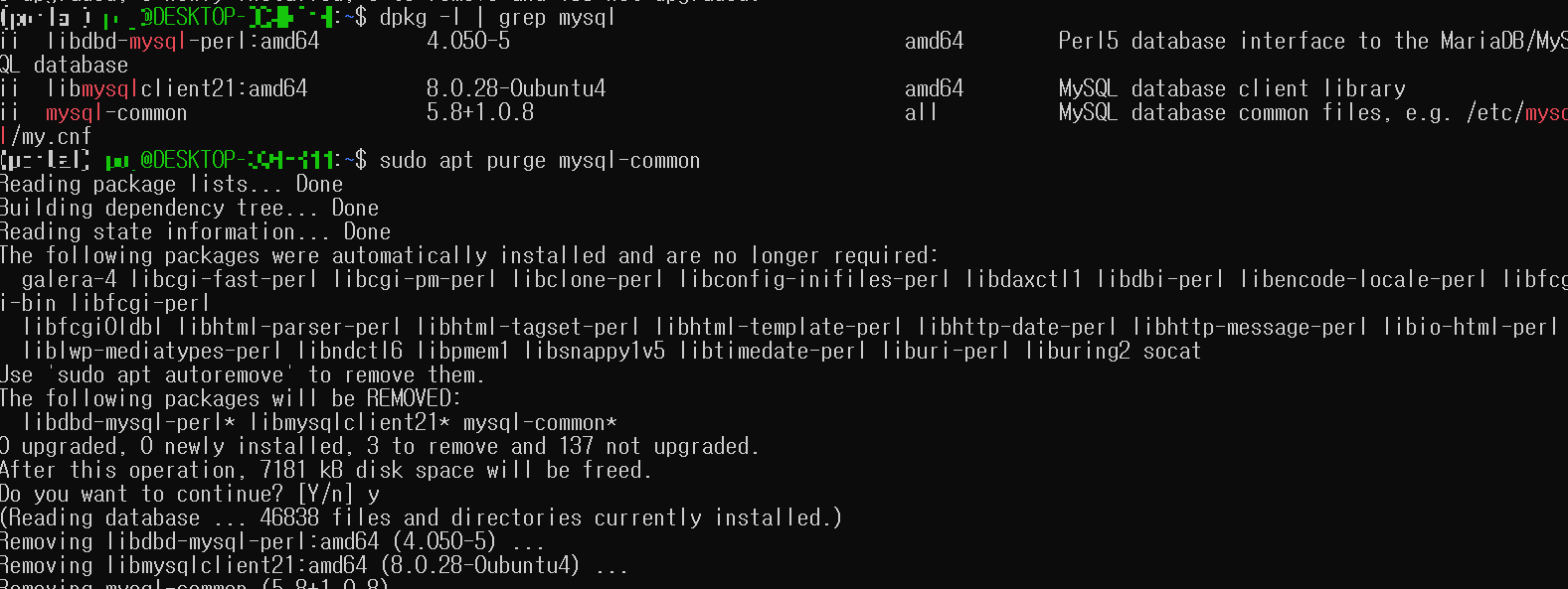 1-4. mysql-common 이 보이면 아래 명령어로 제거합니다. 중간에 계속할 것인지 물어보면 <Y> 를 입력한다.